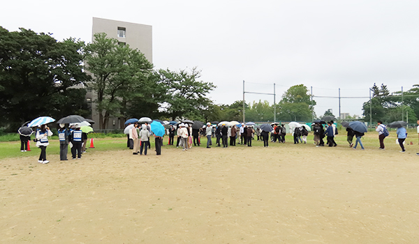 10月20日(月)に富山大学防災訓練を行いました。午後2時に呉羽山断層を震源とする震度6弱の直下型地震が発生した想定のもと、学生や教職員が避難場所に指定されているグランドにそれぞれ避難しました。