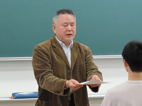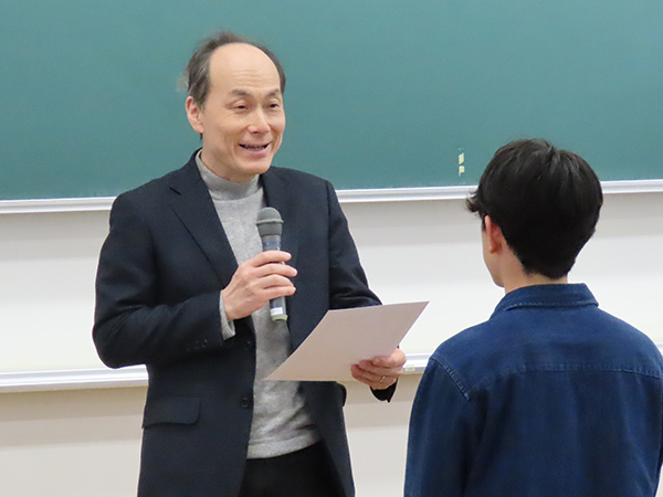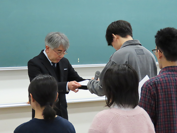 表彰式では、理学部長/学科長から出席者ひとりひとりに表彰状と副賞が手渡されました。