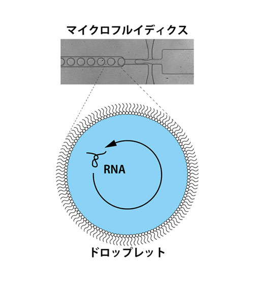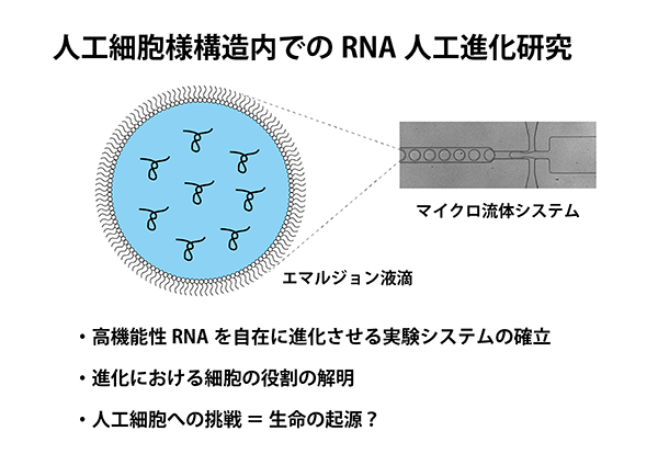生命を構成する主要な分子である核酸やタンパク質は、人工物が及びもつかない精妙な機能を有しており、さらにその機能は驚くほど多様です。そのような極めて高度かつ多彩な機能は、神様が創ったものではなく、自然界の中で自発的に進化してきたと考えられています。どのようにしてこのような進化が可能であったのか、その原理を知ることは、人工的に新たな分子やシステムを創る際の強力な指針となり、果てには「生命とは何か?」という問いに何らかの解答を与えてくれるかもしれません。私は、生命が例外なく細胞であることにその鍵があるのではないかと考え、生命を模倣した系を人工的に構築し解析を行う「構成的な」アプローチに基づき、人工細胞様構造の中で生体高分子、特にRNAを進化させる実験研究を行っています。