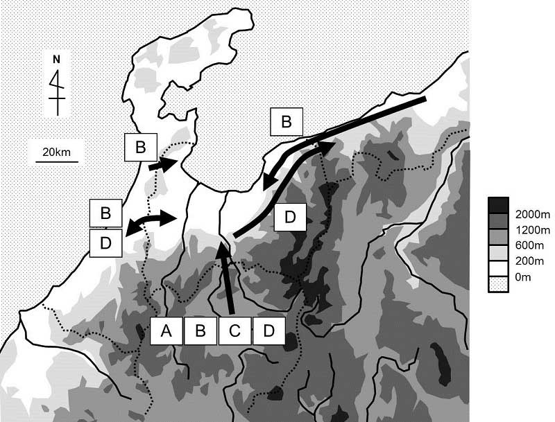 その結果,富山県のイノシシが持つ遺伝子は,大きく4つの型(A〜D)に分けることができました.その4つの遺伝子型について,周辺県における出現状況や経年変化を調べた結果,いずれの遺伝子型も県外から進入してきたことが明らかになりました(図4:山崎ほか, 2015を一部改変).ただその進入ルートは一様ではありませんでした.遺伝子型AとCは,岐阜県側から富山県に進入し,遺伝子型Bは,石川県,岐阜県,そして新潟県の3方向から富山県に進入してきたと考えられます.加えて,富山県から石川県に移動したイノシシの存在も推察されました.さらに,遺伝子型Dは,岐阜県から富山県へ進入したものが,富山県内を東に移動し,その一部は新潟県にまで到達していることが示唆されました.以上のことから,今日富山県に生息しているイノシシは,複数のルートで富山県に進入し,そして今も移動を続けていることが考えられます.