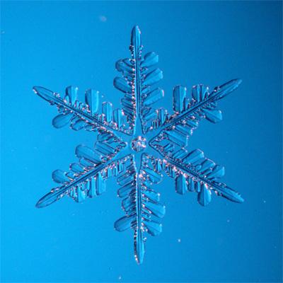 写真4は、樹枝状(じゅしじょう)結晶と呼ばれ、木の枝のように複雑に枝分かれしているのが特徴です。規則正しく枝が並んでいて美しく見えますが、このような枝分かれがなぜ発生するのか、どのような条件で枝分かれするのか、間隔はどのように決まるのか、といった結晶成長のメカニズムについては、まだ良くわかっていません。このように、身近な雪結晶にも、まだ不明な点が多く残っており、研究を進めています。