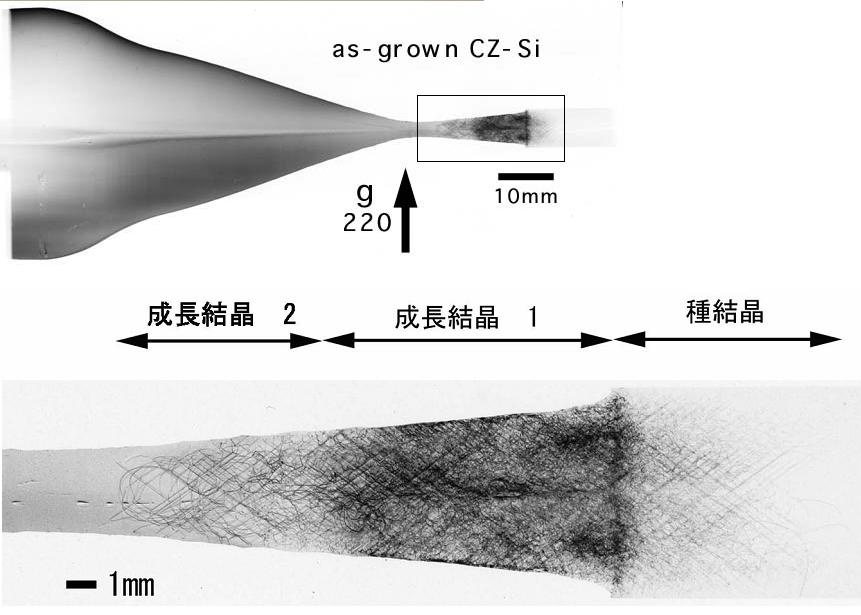 X線トポグラフィの実例を示します.図2-aは観察に用いたシリコン単結晶の外観です.普通のデジカメで撮影したものです.外形が見えています.図2-bは回折X線で撮影した試料内部の透過画像です.線のように黒く写っている領域はその周りの領域と比べて結晶の方向がほんの少し(たったの1000分の1度くらい)だけ傾いています.格子欠陥分野の専門用語では「転位」と呼ばれているものです.ほんのちょっとだけしか傾いていない領域も,X線トポグラフィによって,明瞭に可視化されることが分かっていただけるでしょう.